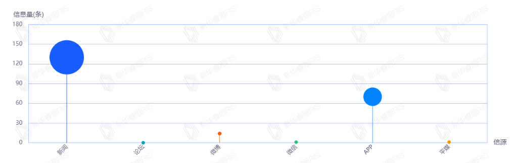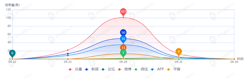 截至目前,该文章在互联网上传播总量135篇。其中4月24日是传播的高峰期,共传播101篇文章。各信源的信息发布情况中,新闻信息占比最大,其次是APP和微博,占比分别为50.37%、34.81%、9.63%。(数据来源:新华睿思数据云图分析平台)