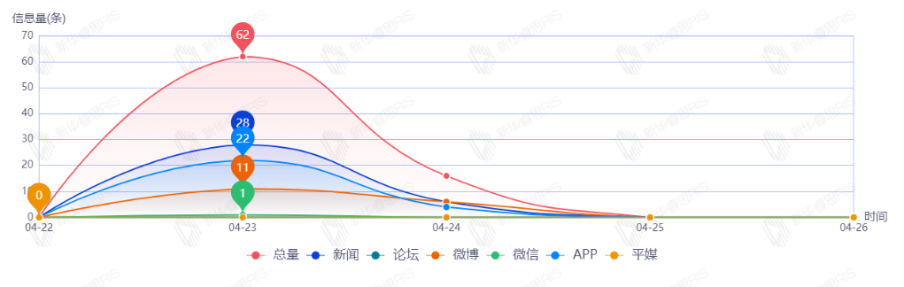 截至目前,该文章在互联网上传播总量78篇。其中4月23日是传播的高峰期,共传播62篇文章。各信源的信息发布情况中,新闻信息占比最大,其次是APP和微博,占比分别为43.59%、33.33%、21.79%。(数据来源:新华睿思数据云图分析平台)