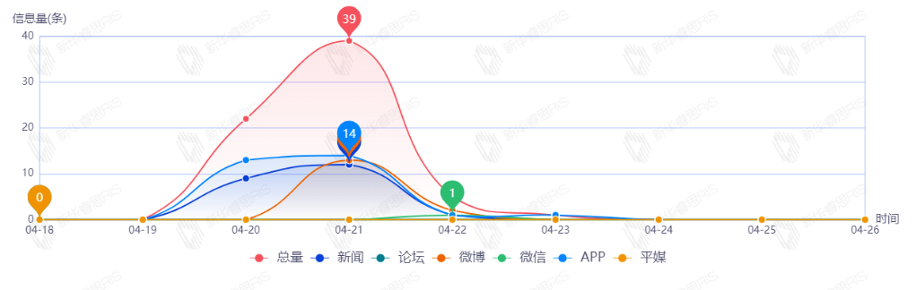 截至目前,该文章在互联网上传播总量67篇。其中4月21日是传播的高峰期,共传播39篇文章。各信源的信息发布情况中,APP信息占比最大,其次是新闻和微博,占比分别为43.28%、32.84%、22.39%。(数据来源:新华睿思数据云图分析平台)