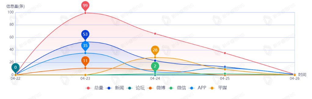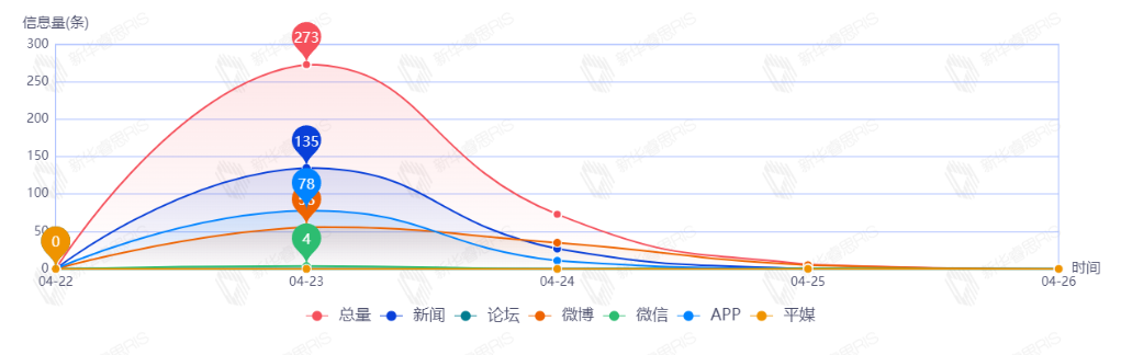 截至目前,该文章在互联网上传播总量201篇。其中4月23日是传播的高峰期,共传播99篇文章。各信源的信息发布情况中,新闻信息占比最大,其次是APP和平媒,占比分别为44.78%、25.37%、18.41%。(数据来源:新华睿思数据云图分析平台)