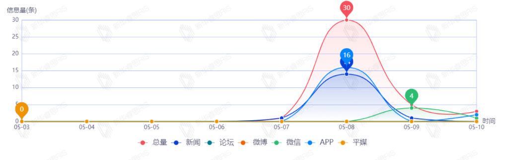 截至目前,该文章在互联网上传播总量共39篇。其中,5月8日是传播的高峰期,共传播30篇文章。各信源的信息发布情况中,APP信息占比最大,其次是新闻和微信,占比分别为46.15%、41.03%、12.82%。(数据来源:新华睿思·数媒智慧分析平台)