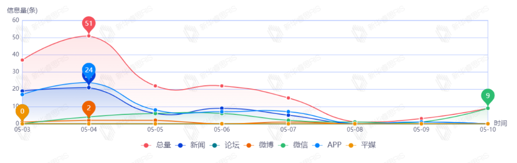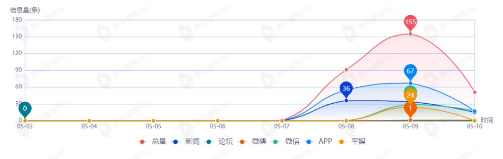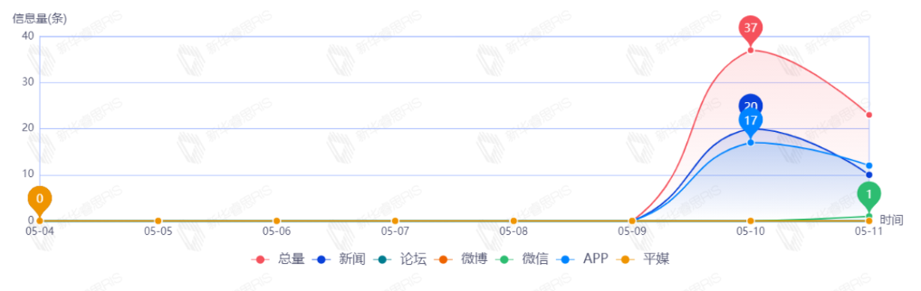 截至目前,该文章在互联网上传播总量共60篇。其中,5月10日是传播的高峰期,共传播37篇文章。各信源的信息发布情况中,新闻信息占比最大,其次是APP和微信,占比分别为50.00%、48.33%、1.67%。(数据来源:新华睿思·数媒智慧分析平台)