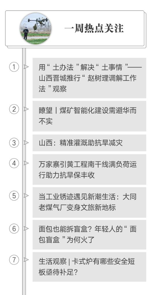 在赵树理的家乡晋城,用“土办法”解决老百姓的“土事情”;面对山西小麦主产区的旱情,引黄工程和精准灌溉来减灾;大同老煤气厂变身文旅新地标,在工业锈迹遇见新潮生活;年轻人与面包盲盒的邂逅,则是一场关于环保与生活的温柔变革。5月5日至11日,新华社记者行走黄土高原,情牵调节事和抗旱事,体验潮生活与新消费。