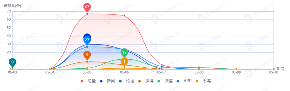 截至目前,该文章在互联网上传播总量共139篇。其中,5月5日是传播的高峰期,共传播67篇文章。各信源的信息发布情况中,APP信息占比最大,其次是新闻和微信,占比分别为38.85%、38.13%、12.23%。(数据来源:新华睿思·数媒智慧分析平台)