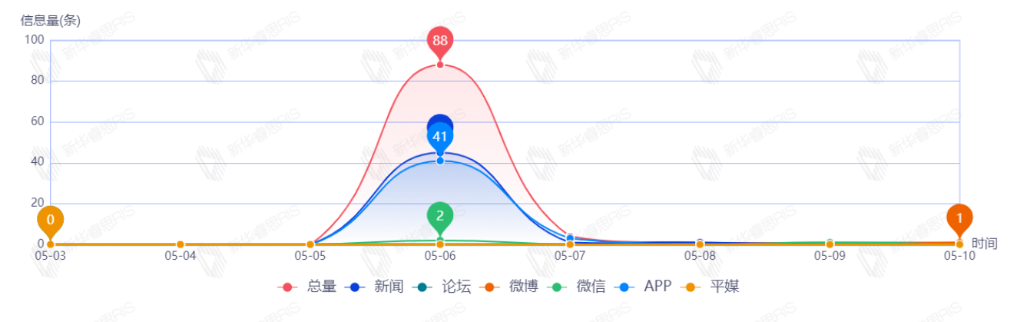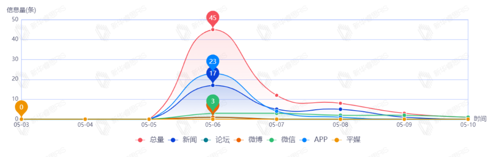 截至目前,该文章在互联网上传播总量共69篇。其中,5月6日是传播的高峰期,共传播45篇文章。各信源的信息发布情况中,新闻信息占比最大,其次是APP和微信,占比分别为40.58%、40.58%、15.94%。(数据来源:新华睿思·数媒智慧分析平台)