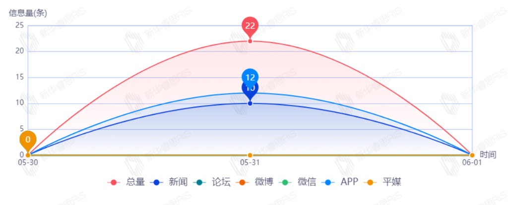 截至目前,该文章在互联网上传播总量22篇。其中5月31日是传播的高峰期,共传播22篇文章。各信源的信息发布情况中,APP信息占比最大,其次是新闻,占比分别为54.55%、45.45%。(数据来源:新华睿思数据云图分析平台)