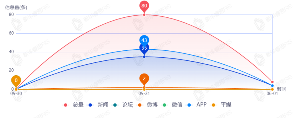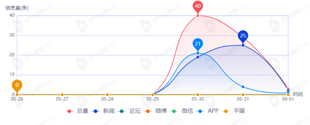 截至目前,该文章在互联网上传播总量72篇。其中5月30日是传播的高峰期,共传播40篇文章。各信源的信息发布情况中,新闻信息占比最大,其次是APP,占比分别为65.71%、34.29%。(数据来源:新华睿思数据云图分析平台)