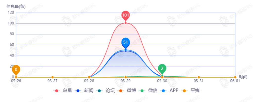 截至目前,该文章在互联网上传播总量100篇。其中5月30日是传播的高峰期,共传播92篇文章。各信源的信息发布情况中,APP信息占比最大,其次是新闻和微博,占比分别为43.43%、35.35%、13.13%。(数据来源:新华睿思数据云图分析平台)