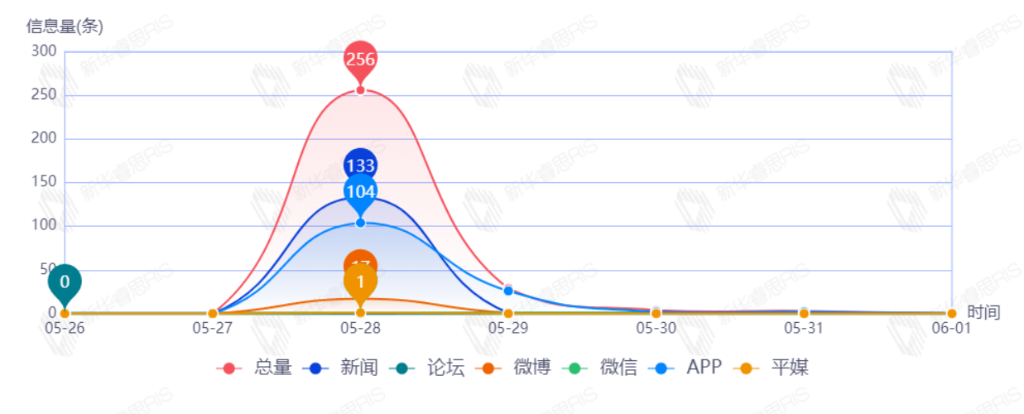 截至目前,该文章在互联网上传播总量292篇。其中5月28日是传播的高峰期,共传播256篇文章。各信源的信息发布情况中,新闻信息占比最大,其次是APP和微博,占比分别为48.23%、46.45%、3.90%。(数据来源:新华睿思数据云图分析平台)