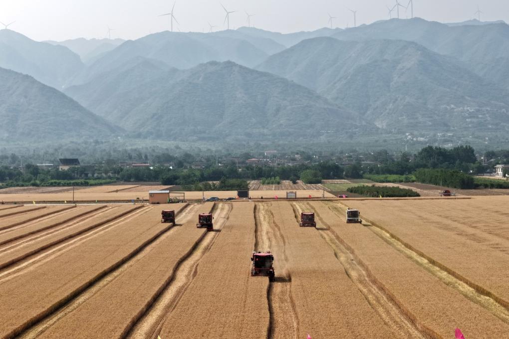 5月底,运城小麦进入大规模机收阶段,种粮大户董会龙和妻子范月亲也迎来一年中最紧张忙碌的日子。金黄的麦田里,合作社的一台台收割机发出隆隆的轰鸣声,不时扬起金色的麦尘,田间一派繁忙景象。(新华社记者詹彦)