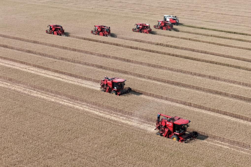 5月31日,在山西省运城市夏县南大里乡南郭村的2600余亩小麦种植基地,一台台收割机在田间破开麦浪,将簇簇麦穗卷入机仓,颗颗饱满的麦粒从收割机中倾泻而出,很快就装满了地头的运粮车。(新华社记者王飞航)