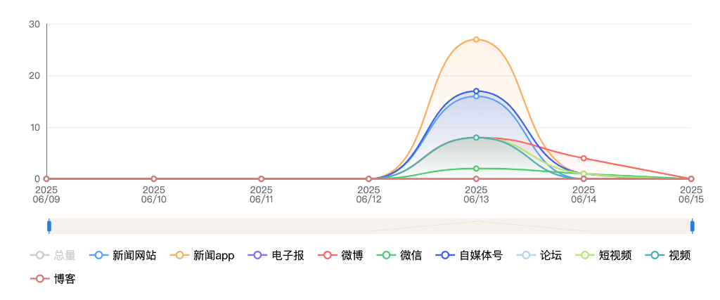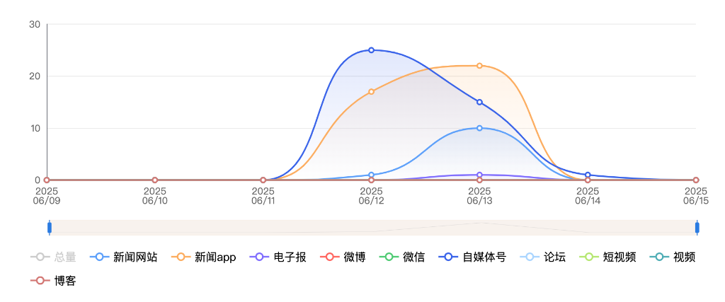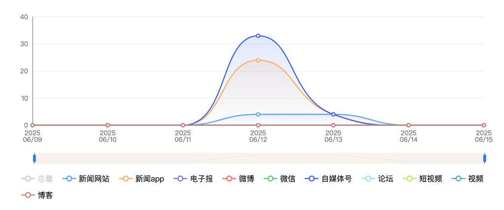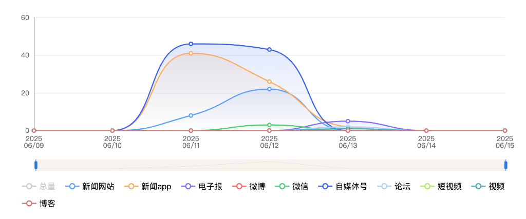 截至目前,该文章在互联网上传播总量共92篇。其中,6月12日是传播的高峰期,共传播43篇文章。各信源的信息发布情况中,自媒体号占比最大,其次是APP和新闻网站,占比分别为44.56%、42.39%、11.96%。(数据来源:新华睿思·数媒智慧分析平台)
