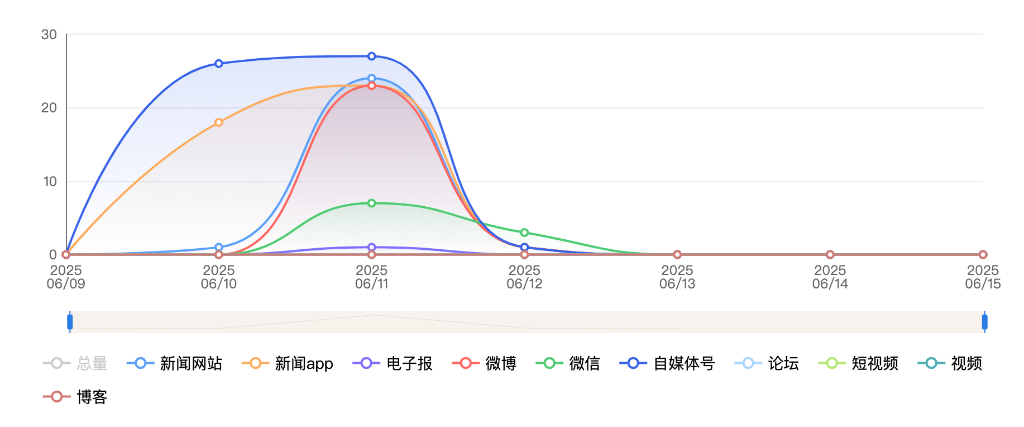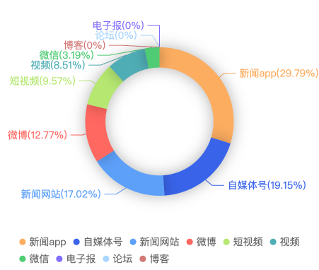 截至目前,该文章在互联网上传播总量共511篇。其中,6月11日是传播的高峰期,共传播126篇文章。各信源的信息发布情况中,自媒体号占比最大,其次是APP和新闻网站,占比分别为41.29%、30.72%、19.57%。(数据来源:新华睿思·数媒智慧分析平台)