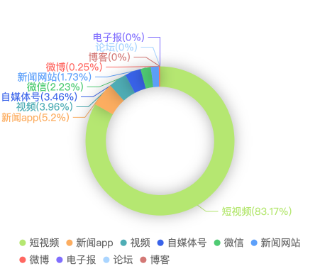 截至目前,该文章在互联网上传播总量共404篇。其中,6月13日是传播的高峰期,共传播386篇文章。各信源的信息发布情况中,短视频占比最大,其次是APP和视频,占比分别为83.17%、5.2%、3.96%。(数据来源:新华睿思·数媒智慧分析平台)