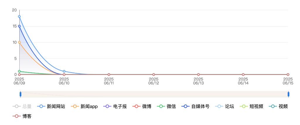 截至目前,该文章在互联网上传播总量共111篇。其中,6月9日是传播的高峰期,共传播52篇文章。各信源的信息发布情况中,APP占比最大,其次是新闻网站和自媒体号,占比分别为28.83%、25.22%、22.52%。(数据来源:新华睿思·数媒智慧分析平台)