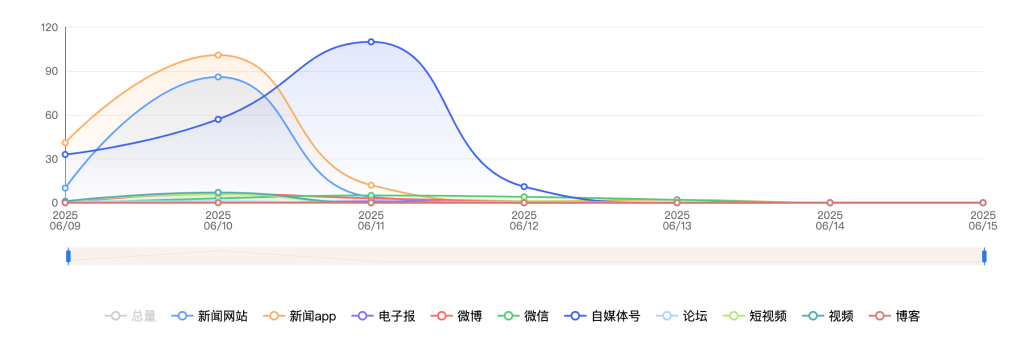 截至目前,该文章在互联网上传播总量共199篇。其中,6月11日是传播的高峰期,共传播95篇文章。各信源的信息发布情况中,自媒体号占比最大,其次是APP和新闻网站,占比分别为44.72%、34.67%、15.08%。(数据来源:新华睿思·数媒智慧分析平台)