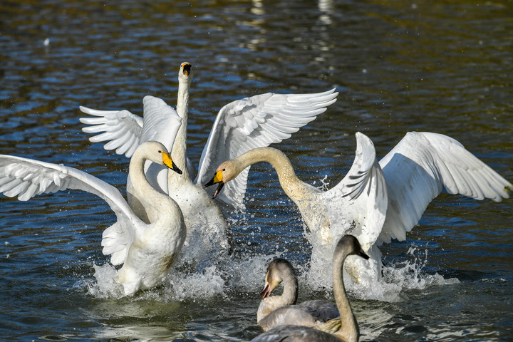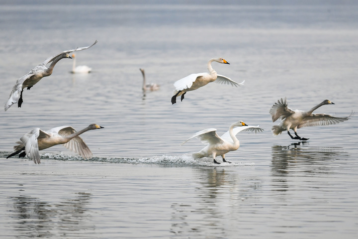 初冬时节,山西平陆黄河湿地迎来了从俄罗斯西伯利亚地区飞来越冬的白天鹅。占地6000多公顷的山西平陆黄河湿地位于山西、河南两省交界处,每年到此越冬的白天鹅数量在1万只左右。(记者 曹阳)