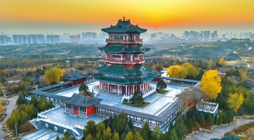 十一月十三日,俯瞰晋中市榆次区百草坡森林植物园,冬日暖阳将古朴的晨曦阁装扮得明艳亮丽,红墙绿瓦、斑斓彩林与远处的城市风貌,描绘出一幅优美的画卷。(张耀宇摄)