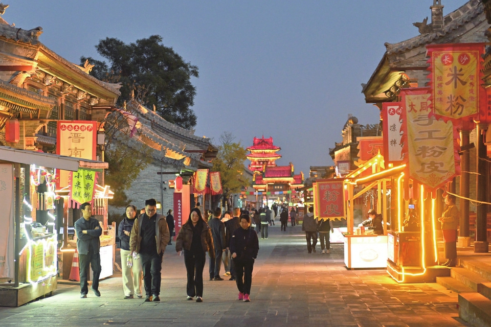 11月16日晚,太原古县城灯火璀璨,古建筑在灯光映照下韵味尽显。游客们悠闲漫步于街巷间,尽享惬意时光。(记者范文静摄)