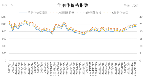 12月1日,怀仁羊胴体价格指数报927.32点,较上期下跌0.77%,A级胴体价格报24.53元/斤,较上期下跌0.24元/斤,跌幅0.97%;B级胴体价格报24.67元/斤,较上期下跌0.19元/斤,跌幅0.76%;C级胴体价格报24.05元/斤,较上期下跌0.12元/斤,跌幅0.50%。