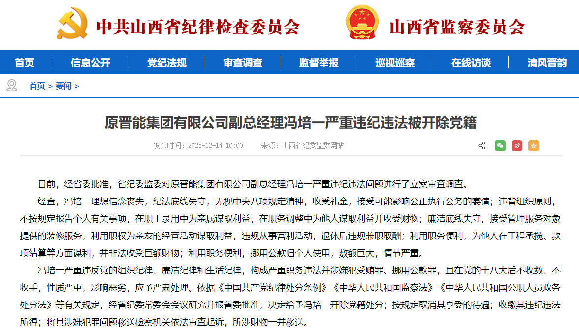 日前,经省委批准,省纪委监委对原晋能集团有限公司副总经理冯培一严重违纪违法问题进行了立案审查调查。