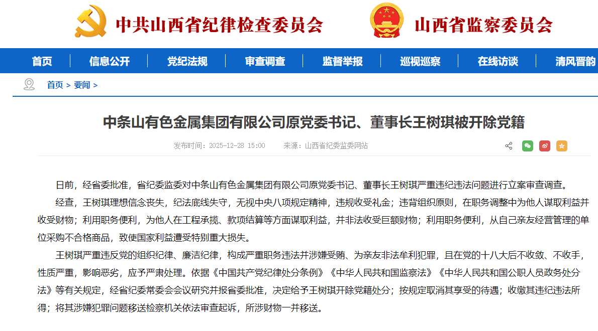 日前,经省委批准,省纪委监委对中条山有色金属集团有限公司原党委书记、董事长王树琪严重违纪违法问题进行立案审查调查。