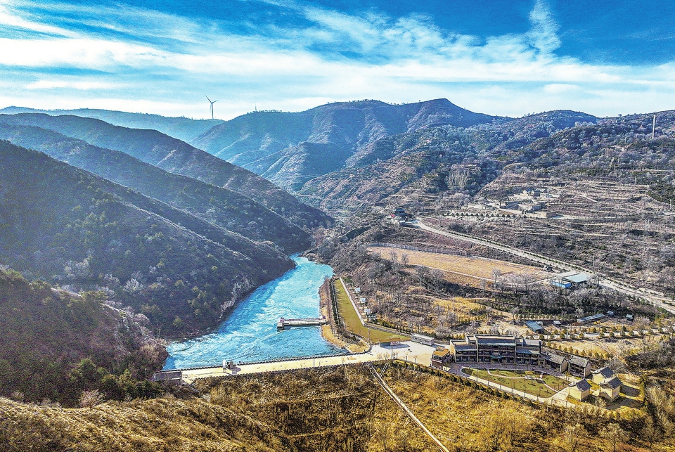 12月28日,平遥县东泉镇境内,湖水如碧绸般舒展,山峦层叠如黛,错落的建筑与远山相映,绘就一幅静美的生态画卷。(梁生仁摄)