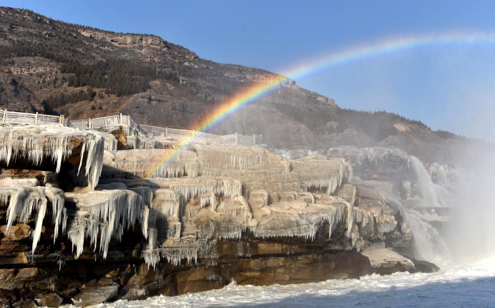 连日来,受持续降温天气影响,位于山西吉县和陕西宜川县交界的黄河壶口瀑布出现“冰瀑玉壶”景观,吸引了不少游客前来欣赏“母亲河”的冬日壮美景色。(记者王飞航)