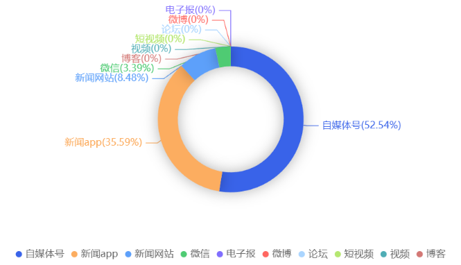 截至目前,该文章在互联网上传播总量共59篇。各信源的信息发布情况中,自媒体号占比最大,其次是新闻APP。(数据来源:新华睿思·数媒智慧分析平台)