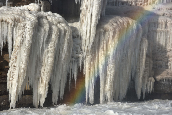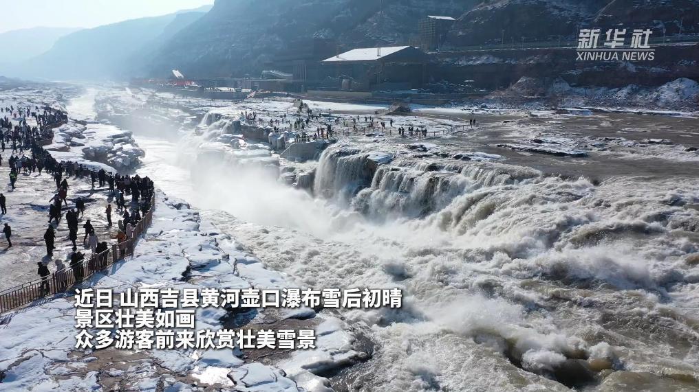 近日,山西吉县黄河壶口瀑布雪后初晴,景区壮美如画,众多游客前来欣赏壮美雪景。从空中俯瞰,瀑布仿佛披上了一层洁白的轻纱,黄河水夹杂着流凌从上游呼啸而下,跌入十里龙槽,激起阵阵白色水雾,经阳光折射后,一道美丽的彩虹若隐若现,美不胜收。(新华社记者张哲 报道员吕桂明)