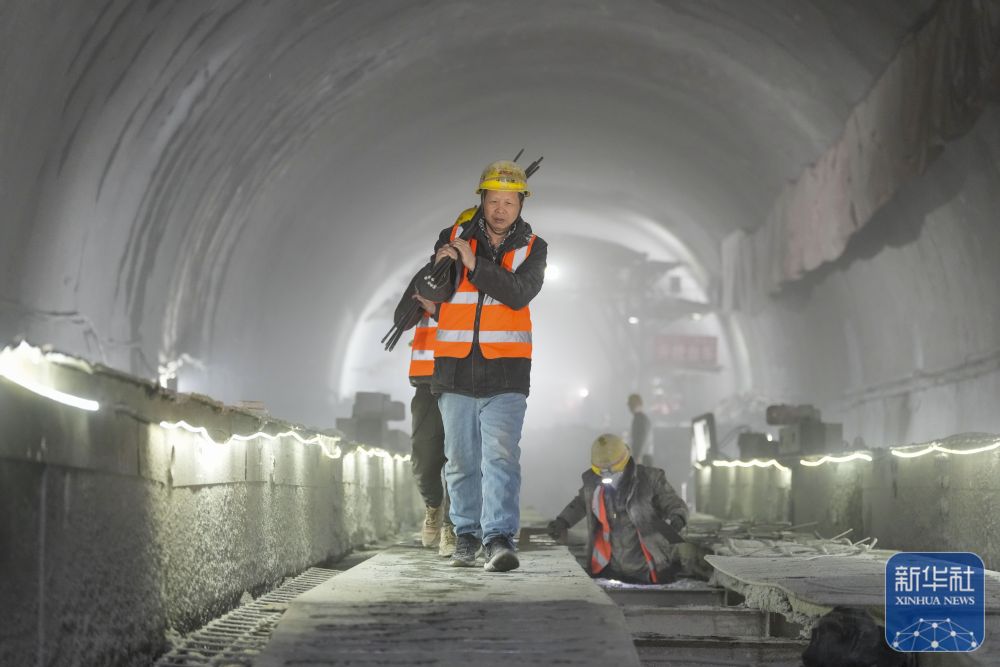 1月12日,中铁十一局集团有限公司的工作人员在雄忻高铁北太行山隧道内搬运建材。