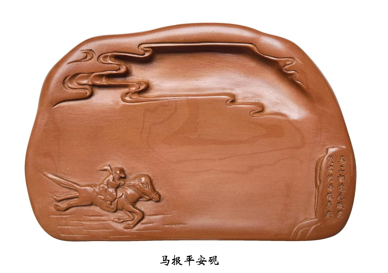 其中,“马到成功砚”兼具动态美感与昂扬气势,椭圆形砚身之上,骏马昂首嘶鸣,鬃尾如烈焰翻飞,周身祥云环绕。这一作品以浅浮雕与线刻技法刻画马匹肌肉线条与飘逸鬃毛,充满力量感。“马报平安砚”巧用唐代诗人岑参“马上相逢无纸笔,凭君传语报平安”的诗句意境,塑造出骏马疾驰、信使传讯的生动画面。砚面右侧镌刻经典诗句,与画面相映成趣,整体造型飘逸灵动。(孙永年 卫世新)