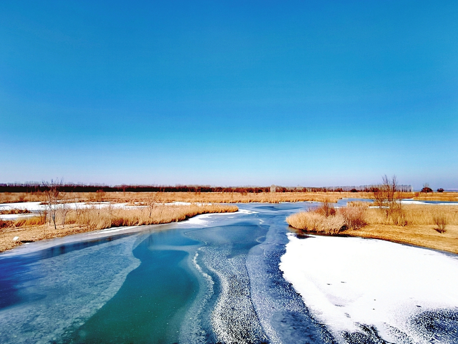 1月16日,记者探访漳泽湖国家城市湿地公园。循着芦荻湾畔的环湖步道徐行,冬日暖阳洒落湖面,近岸处薄冰覆盖,透着凛冽清寒;远处湖水澄澈湛蓝,泛着细碎光泽,水与冰相交,在寒意中交织出丰富的层次。湖中芦苇虽已枯黄,苇秆却一簇簇挺得笔直,寒风掠过,微微摇曳,一派北国风光的粗犷。向东望去,几处湖湾却另有一番景致:在水下推流曝气系统的作用下,这里水面未冻,一汪墨绿碧如翡翠,泛着粼粼波光。几座古色古香的石桥静卧水上,亭台廊榭点缀其间,勾勒出几分江南水乡的温婉,不时有游客驻足拍照,记录下这幅静美画卷。