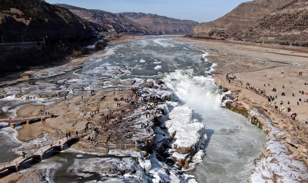受近日寒潮天气影响,黄河中游晋陕峡谷流凌密度持续增大,位于山西吉县和陕西宜川县交界的黄河壶口瀑布段1月21日出现今年首次流凌封河景观。(记者王飞航)