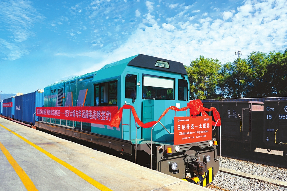 二○二五年七月十七日,一列中欧(亚)班列驶入太钢集团采购中心仓储作业区站台线。通讯员摄