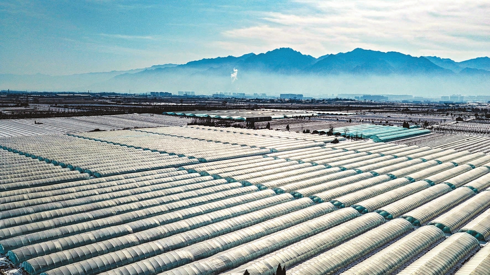 1月28日,在永济市栲栳镇过远村一农场里,温室大棚整齐排列,与远山相映成趣,构成一幅静谧壮阔的田园冬景图。(程永仁摄)
