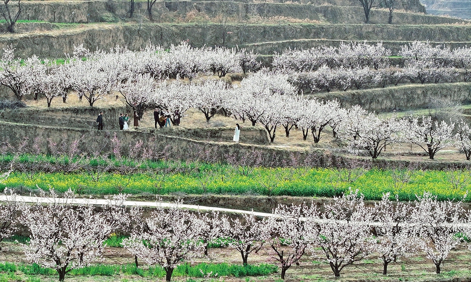 3月18日,游人在稷山县翟店镇仁和村的梯田上游赏。随着气温回暖,仁和村梯田上的杏花与油菜花竞相绽放,勾勒出一幅生机盎然的春日田园画卷,吸引众多游人前来踏青赏花、拍照打卡。(栗卢建摄)