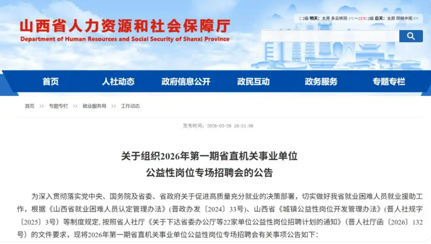 我省就业困难人员注意啦。2026年第一期山西省直机关事业单位公益性岗位专场招聘会将于4月16日14:30—16:30在省就业服务局一楼大厅(太原市新建南路81号)举办。本次共有22家省直单位推出114个岗位,面向全省认定的就业困难人员公开招聘,符合条件者可现场洽谈应聘。