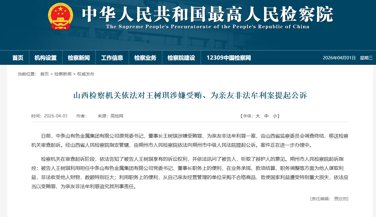 日前,中条山有色金属集团有限公司原党委书记、董事长王树琪涉嫌受贿罪、为亲友非法牟利罪一案,由山西省监察委员会调查终结,移送检察机关审查起诉。经山西省人民检察院指定管辖,由朔州市人民检察院依法向朔州市中级人民法院提起公诉。案件正在进一步办理中。